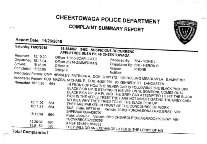 This police complaint was created by Patrica (Vito) Hensley, daughter of Peter Vito (former head of Erie County Central Police Services) & Michael Mazga. This incident never occurred at an apple tree and never involved Patricia Vito.